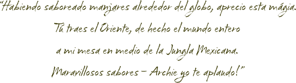 Pronto nos llegaron las lecciones de todo tipo, pero la más seria ocurrió cuando Archie falleció en Abril de 1993. De pronto nos sentimos arrojados a un futuro incierto en el cual Archie no participaría esta vez. ¿O quizás si? Creo que los aromas lo atraen ocasionalmente para observar y supervisar. Su gracia con el cuchillo se muestra mágicamente en la mano de su hijo Sergio. Su cálida hospitalidad se siente con la reluciente sonrisa de su hija Kiyoki. Su filosofía de negocio tan sencillo: “recuerde, Archie’s Wok es un restaurante familiar, y el mundo entero es nuestra familia.”
